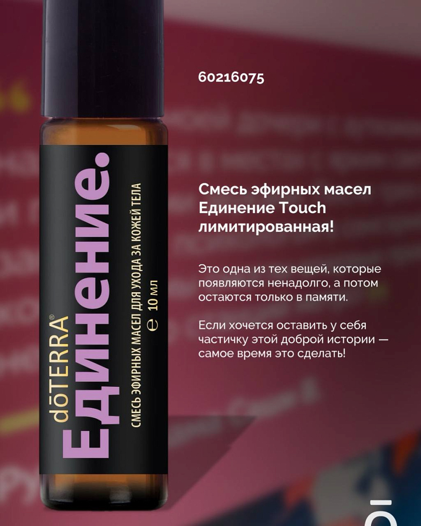 Смесь эфирных масел dōTERRA Единение Touch — это аромат настоящего тепла, дружбы и поддержки. Как объятие близкого человека в трудный момент, этот аромат обволакивает, успокаивает и наполняет положительными эмоциями.